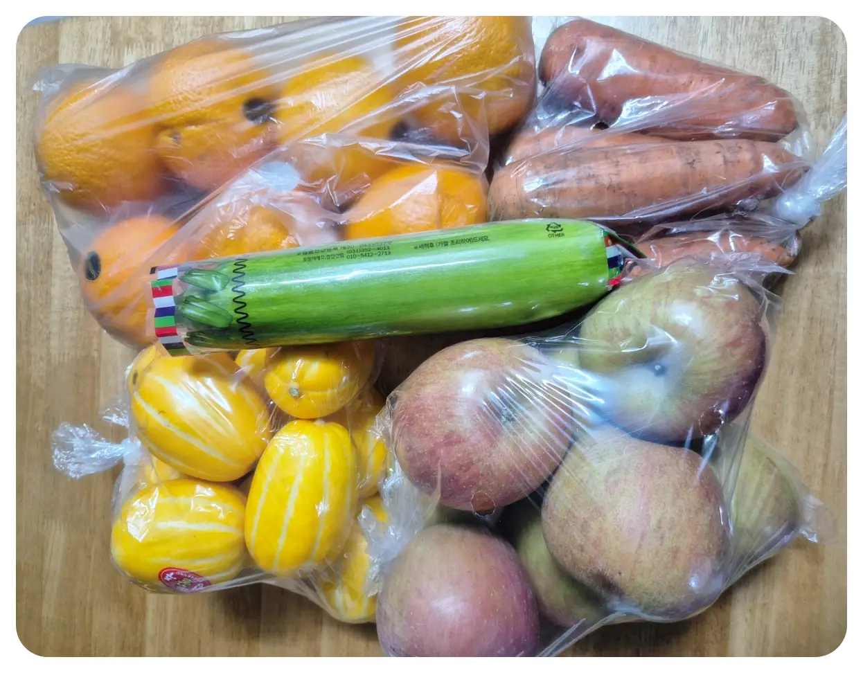 오늘은 오렌지와 참외, 사과, 당근, 애호박을 사 왔어요.