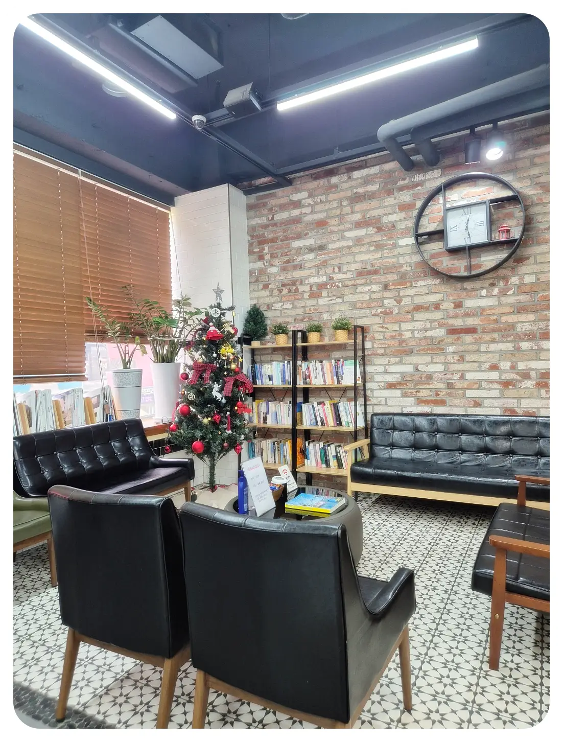 기다리는 동안 토스트와 커피가 있어 배를 좀 채워도 좋고요.책장에 볼만한 책들도 준비되어있어 심심하진 않아요.